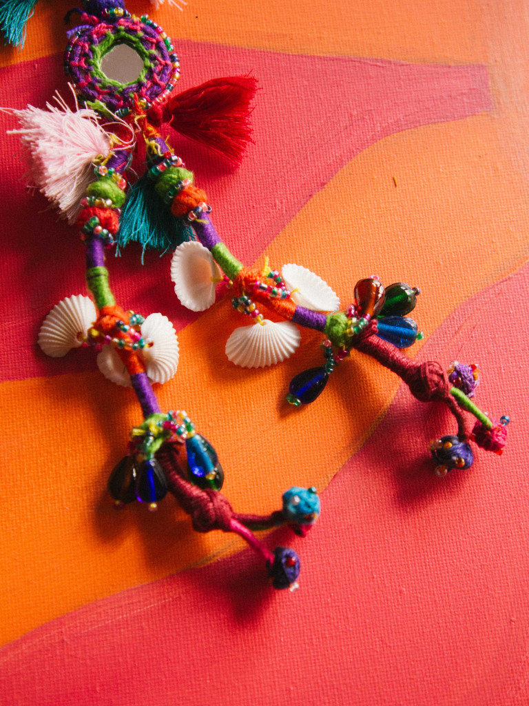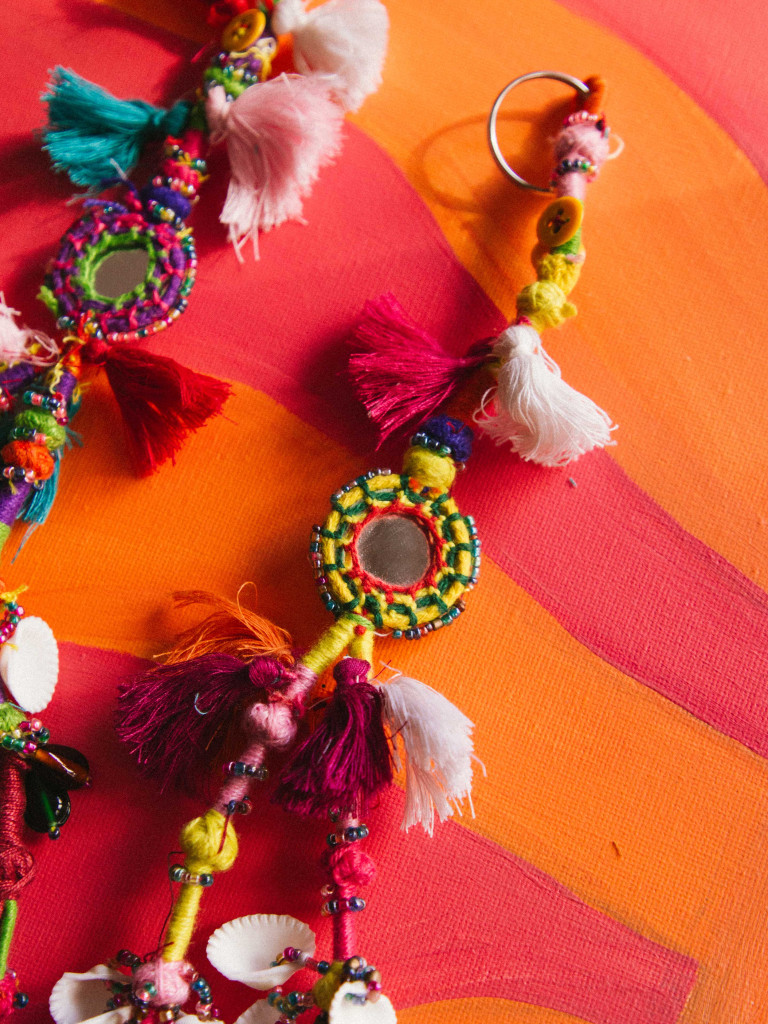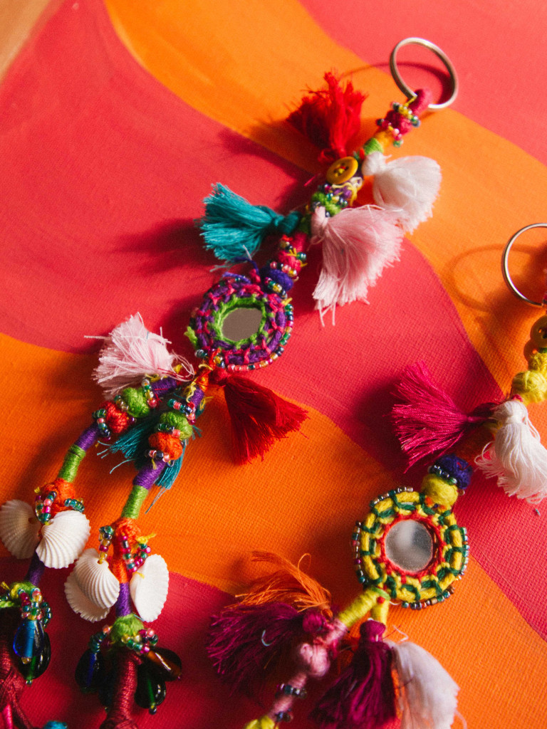 “Magic Mirror” keyring, a handcrafted piece made in India, bursting with colour and personality. Each design combines embroidered threads, small beads and fabric details with a central mirror that adds a special and unique touch.
