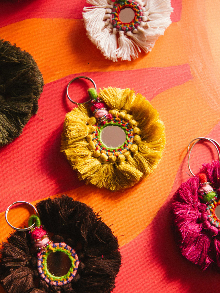“Magic Mirror” keyring, a handcrafted piece made in India, bursting with colour and personality. Each design combines embroidered threads, small beads and fabric details with a central mirror that adds a special and unique touch.