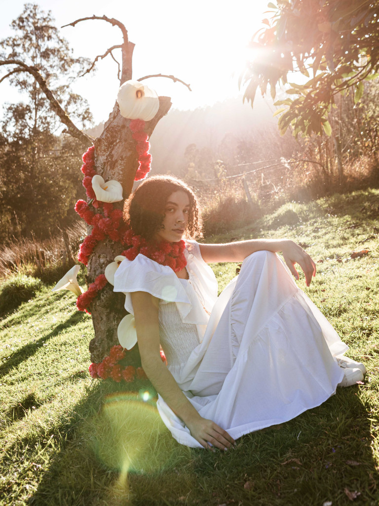 The skirt features a full flare that adds movement, lightness and that bohemian flair that makes it so special. At the neckline, a subtle detail allows you to tie a bow, whilst the cowl neck adds a romantic touch.
