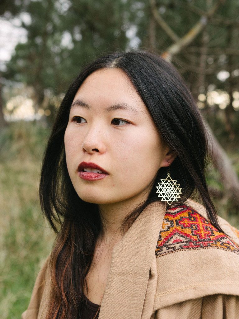 The Sri Yantra earrings are a piece steeped in symbolism and sacred beauty. Their geometric design, composed of intertwined triangles, represents the union of the feminine and masculine, creative energy and inner balance.