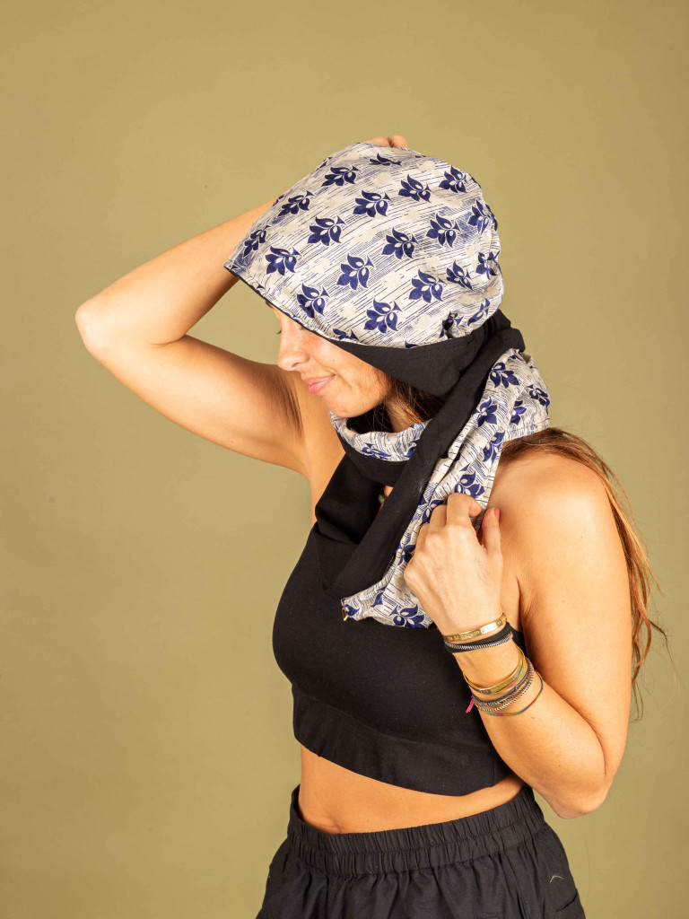 A poncho with a square base with an open front so you can play with its multiple positions.