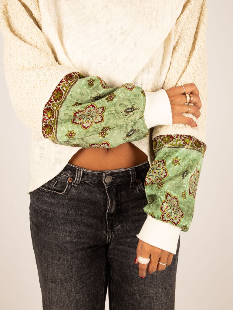 Opening Heart is a garment handmade from a soft, openwork cotton fabric in off-white with an asymmetrical design in the centre and a touch of colour on the sleeves featuring our wonderful sarees, which we give a second life.