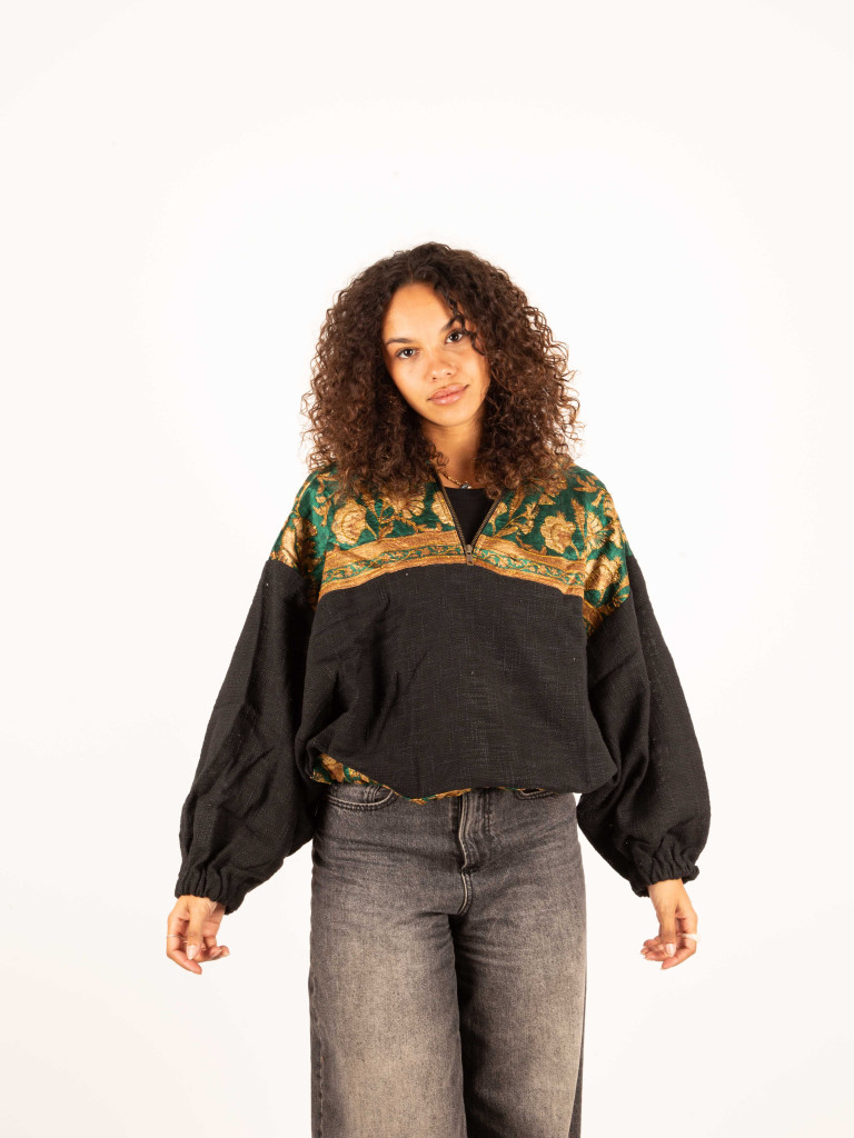Handcrafted in a soft 100% black cotton fabric and decorated in this case with very special embroidered saree fabrics.