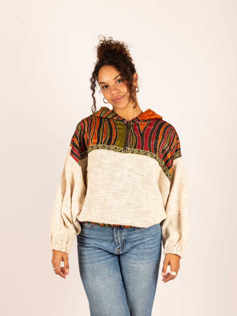 The sleeves are batwing style and it has a hood.