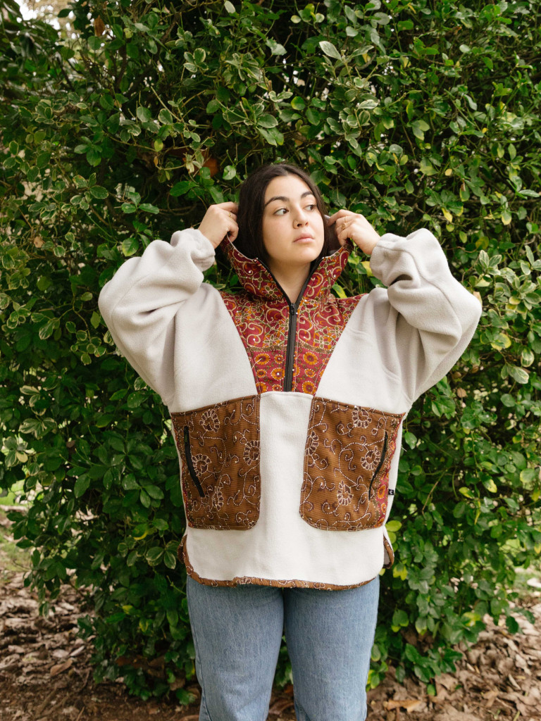 This very warm grey fleece is made from very special embroidered saree fabrics, making each garment unique and handcrafted. It has a high collar and hood, perfect for windy days, with two side pockets.