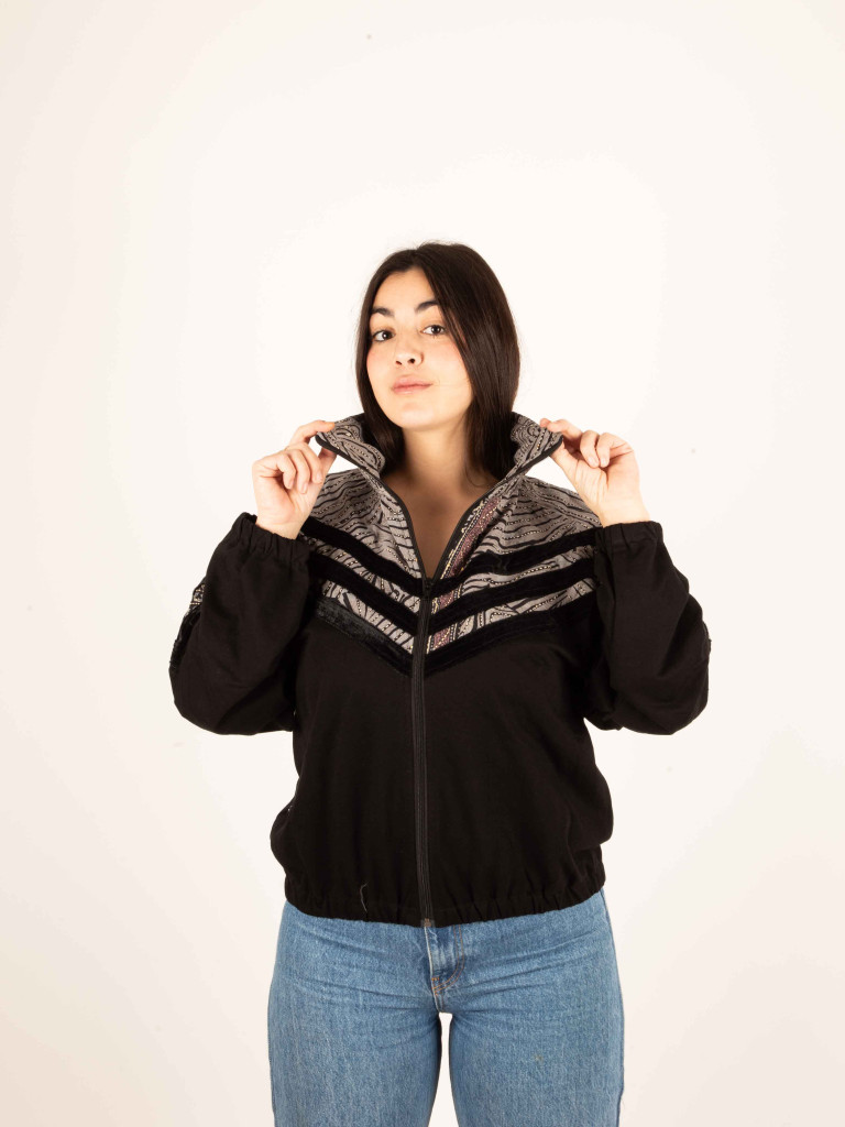 They are made of sweatshirt fabric in a black colour and are decorated with Indian sarees selected one by one with lots of love.