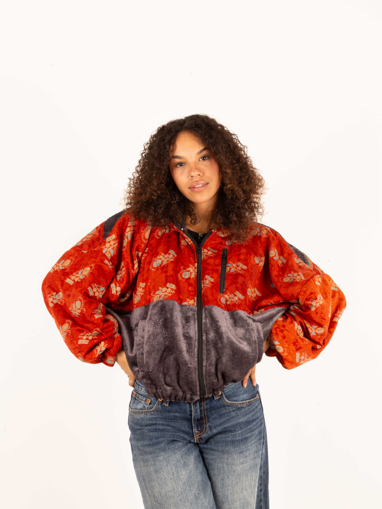 A jacket made from a super cosy and warm fabric, decorated with traditional Indian fabrics from recycled sarees. It has a hood, perfect for windy days, with two side pockets and a chest pocket with a zip fastening.