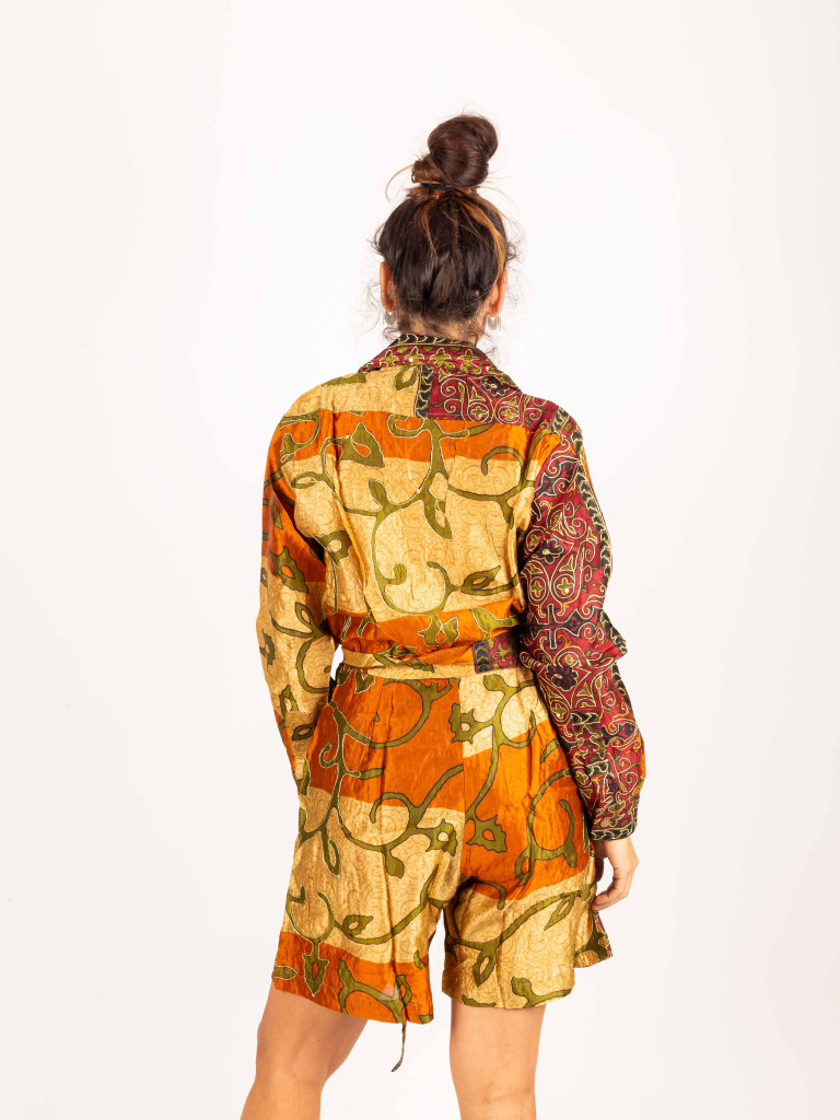 Being handmade from recycled sarees, each jumpsuit tells a unique story, respectful of the environment and full of cultural significance.