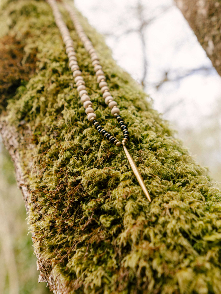 Handcrafted, the Mala Recolecta pendant combines the warmth of wood with the subtle sheen of bronze, creating a unique piece to accompany you in your daily life.