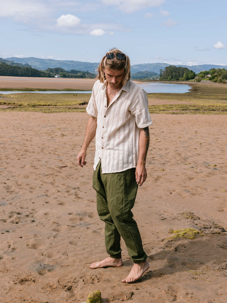 It is made of a soft jute fabric in moss colour and dyed with natural dyes.