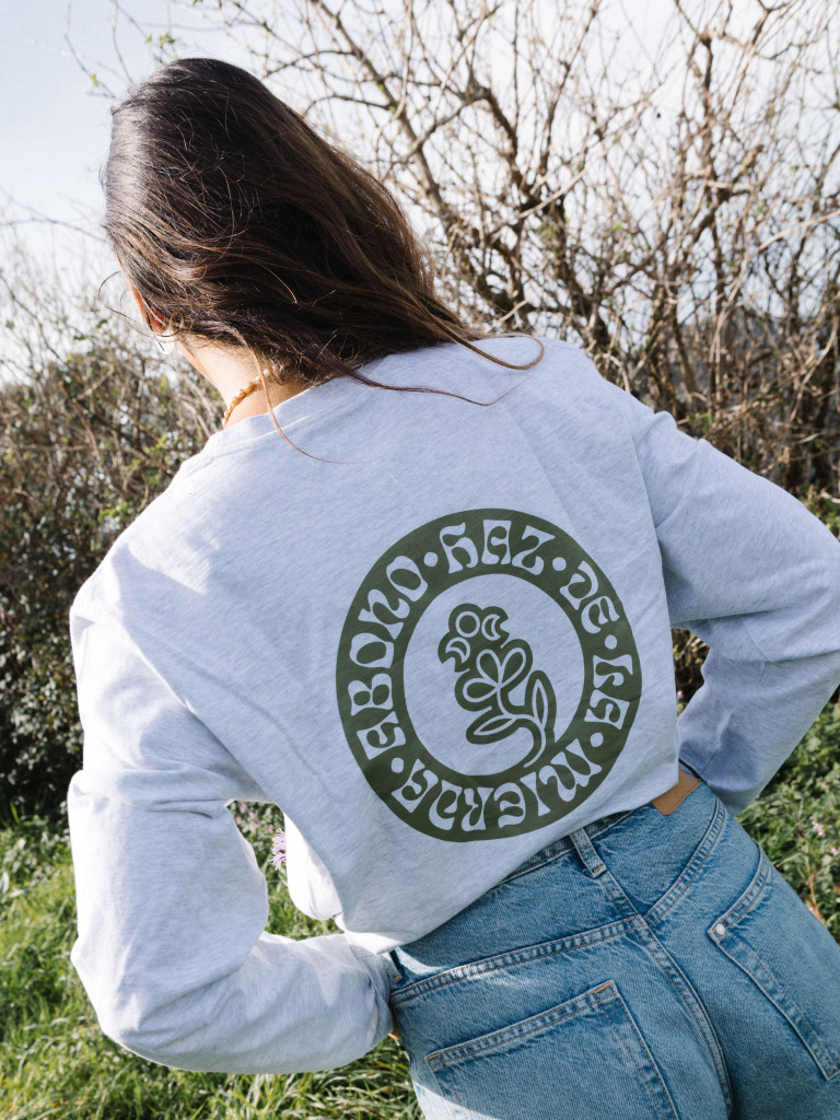 A basic, oversize style T-shirt in a mottled grey colour and with the illustration in green.
