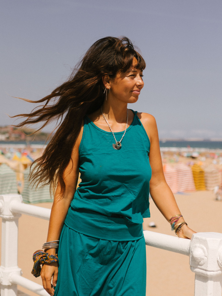 Our new top model matches the baggy trousers. It is green and blue (viridian) in colour and is handmade from a cotton and lycra blend fabric.