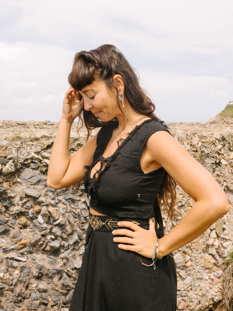 It features a beautiful neckline on the chest and back. It has a frayed effect all around the edge of the fabric, giving it a worn and authentic look.