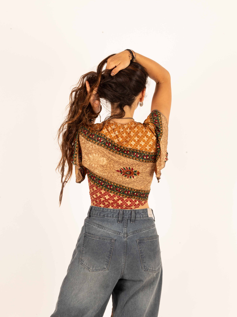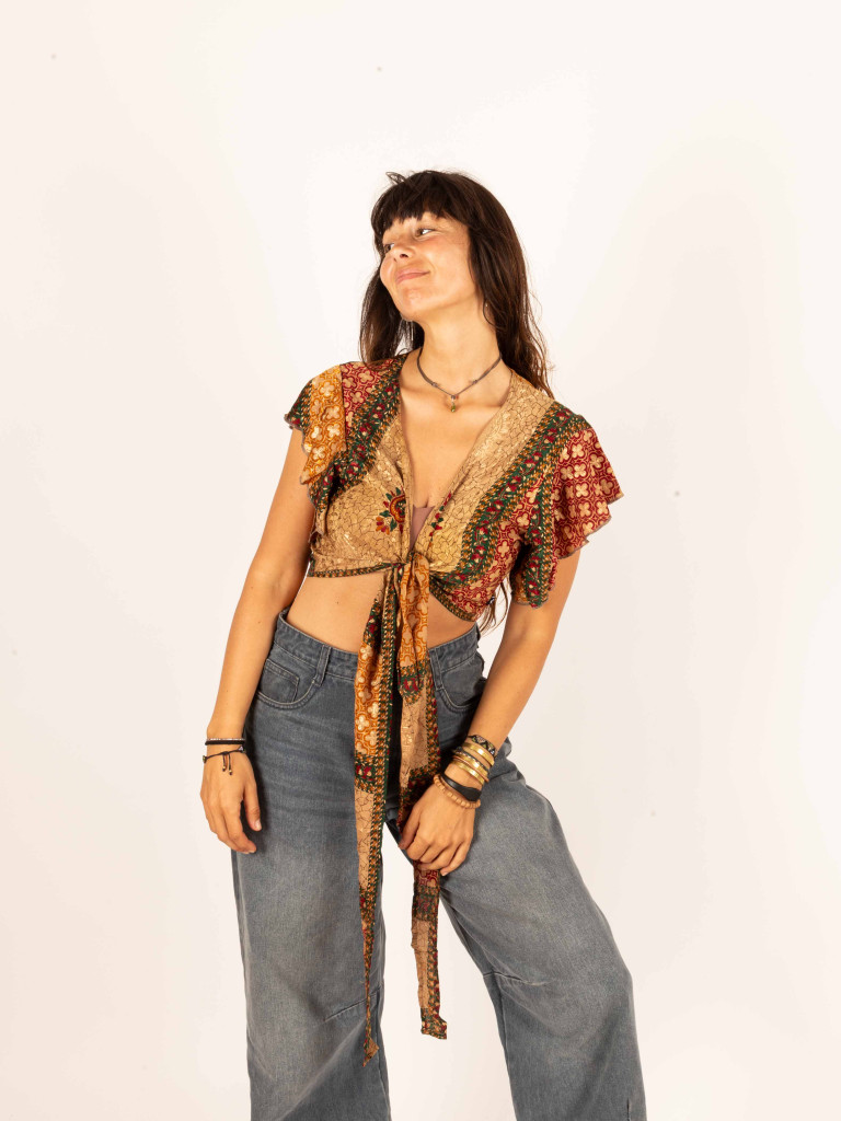 It is tied with a bow and you can give it your personal touch, leaving a more open or closed neckline, as you like!
