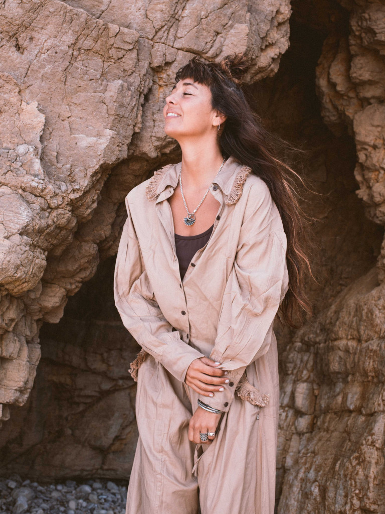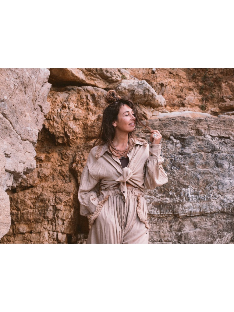 The shirt has a classic design but a little crop with buttons on the front, with slightly puffed sleeves and cuffs at the bottom to adjust them to your liking. The touch that makes it even more special is the fringe detail on the collar.