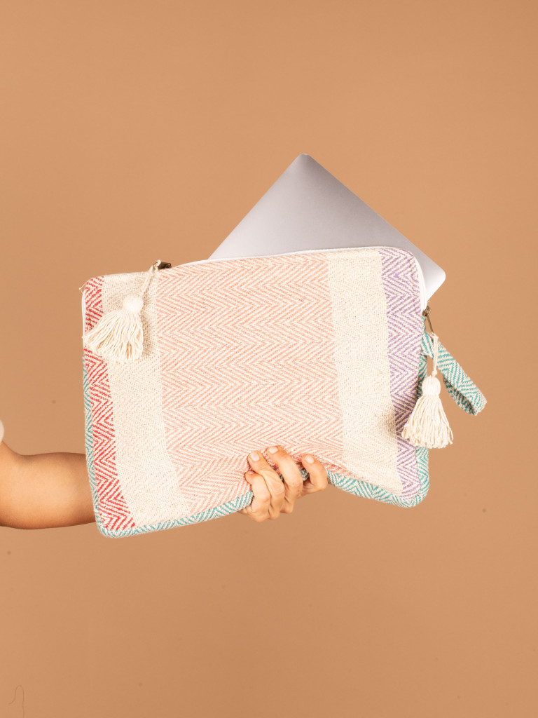 Funda de ordenador elaborada artesanalmente con tejido de cáñamo, un material natural, resistente y sostenible. Su diseño en patrón de espiga en tonos neutros aporta un estilo minimalista y atemporal, ideal para el uso diario tanto en entornos profesionales como personales.