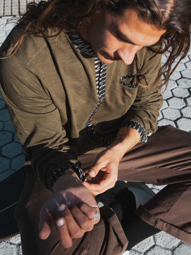 Botones de coco y un pequeño bolsillo en el pecho izquierdo.