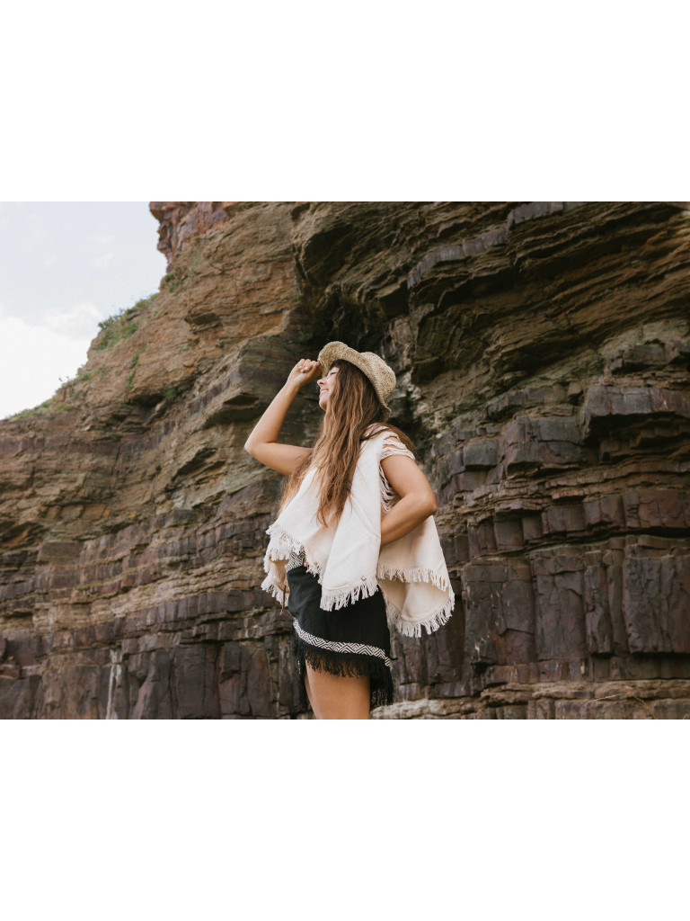 Un poncho blanco roto de corte oversize con un diseño original que deja los brazos al descubierto, aunque puedes jugar y ponerlo de diferentes maneras.