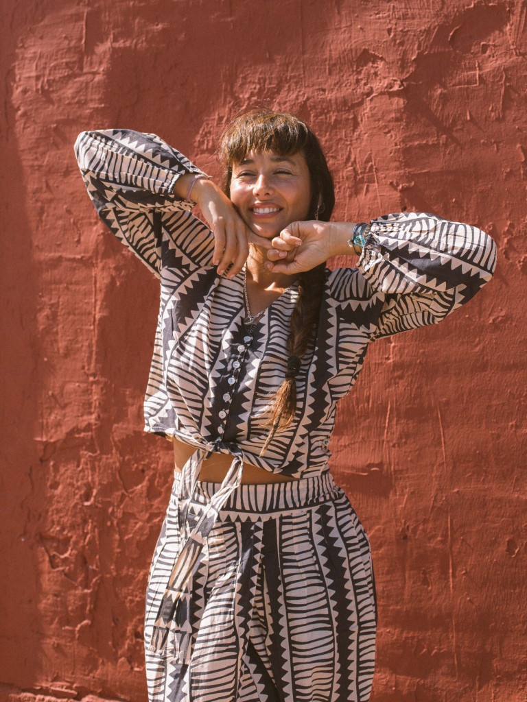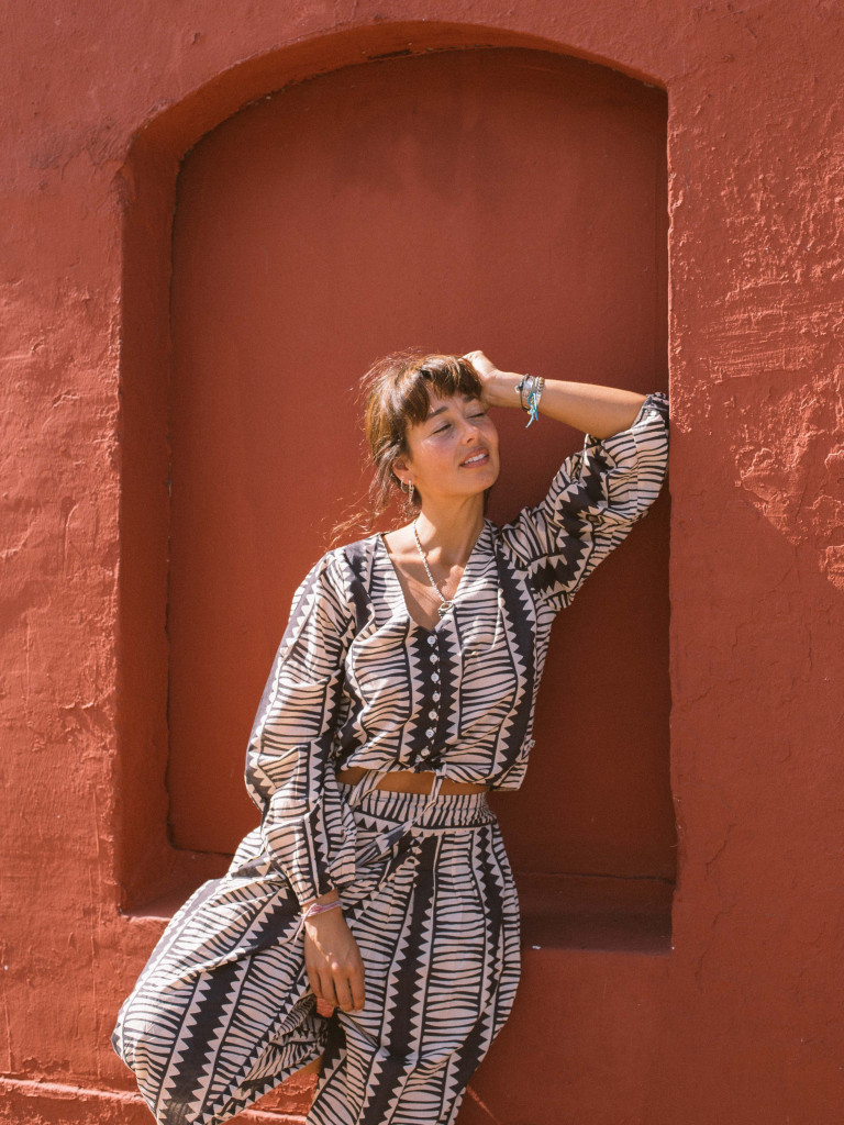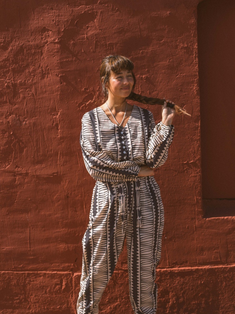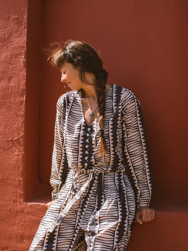 Confeccionada a mano en un fino tejido 100% algodón con un estampado étnico en color crema y gris azulado que tanto favorece.