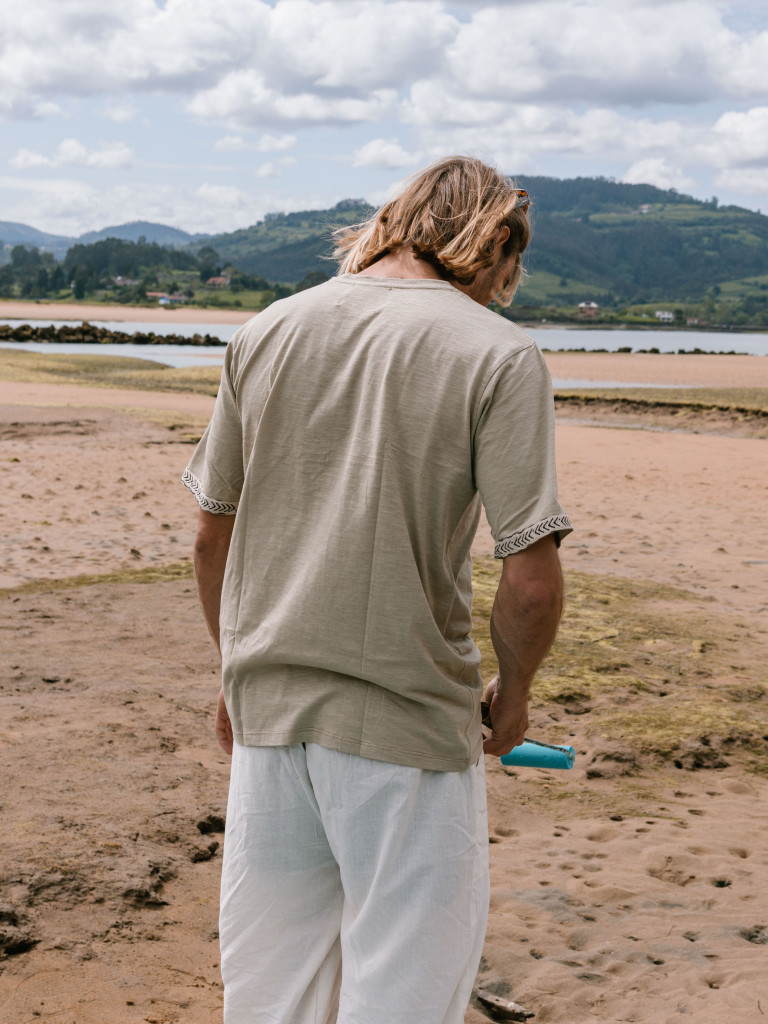Tiene detalles étnicos bordeando las mangas y un detalle bordado en el pecho.
