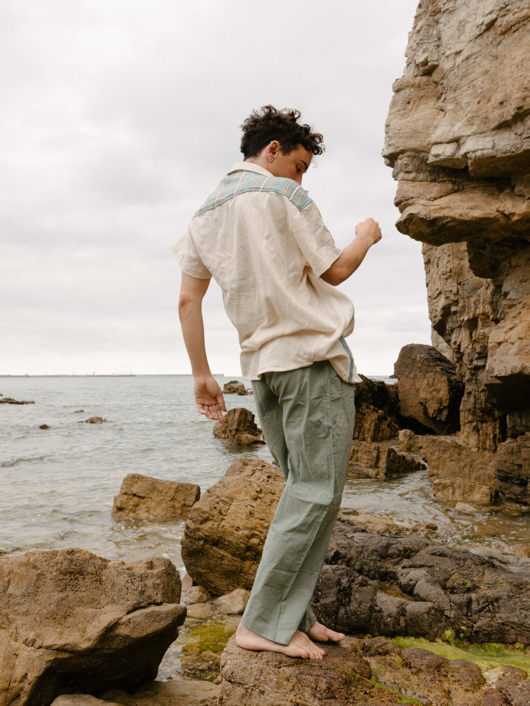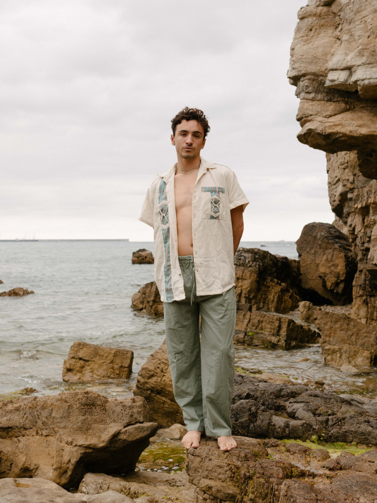 Tiene botones de coco y detalles de tejido estampado etnico en color azul agua tanto por la parte frontal como por detrás.