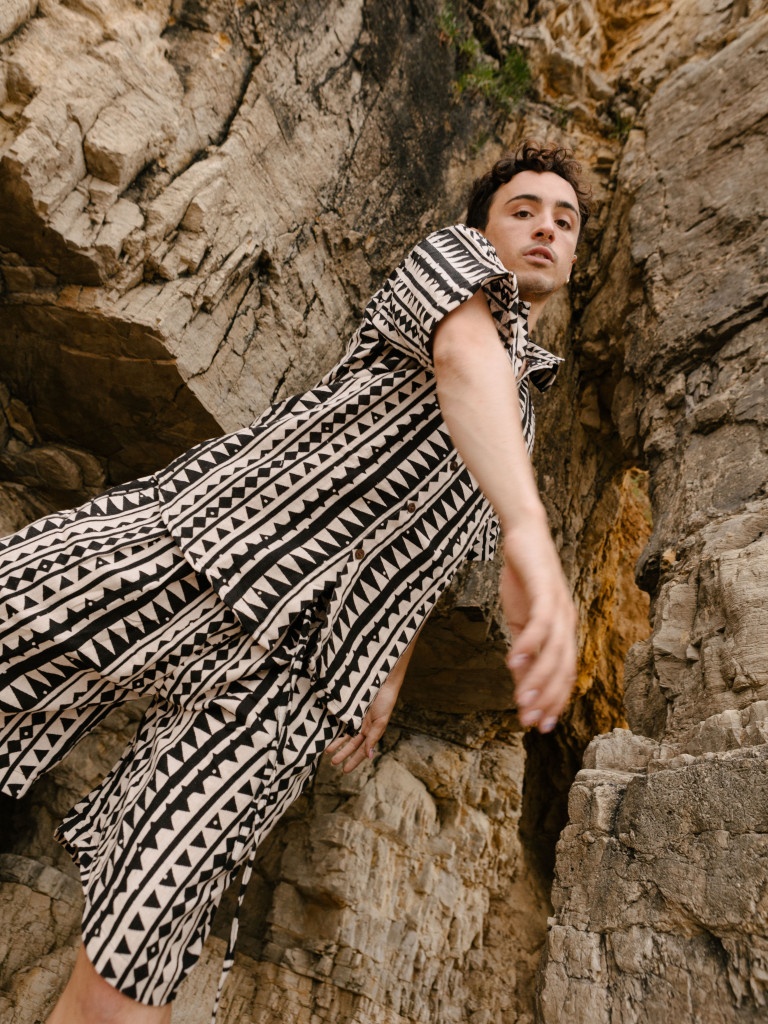 Está confeccionada a mano con tejido natural 100% algodón en color blanco roto, con un precioso estampado de handblock etnico por toda la camisa.