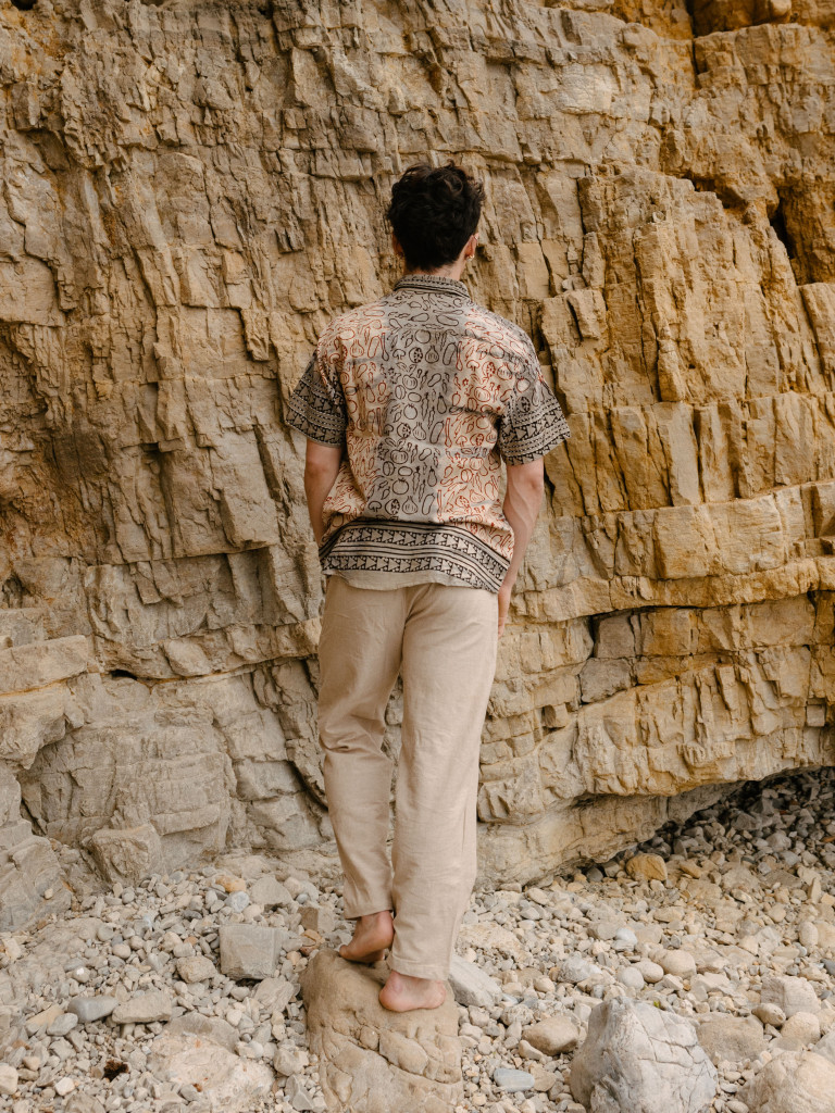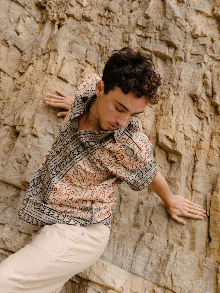 Nuestra nueva camisa confeccionada a mano con tejido natural 100% algodón combinando colores grises, negros, rojos y cremas, con un precioso estampado Handblock de frutas y verduras y detalles bordados.