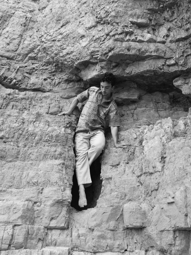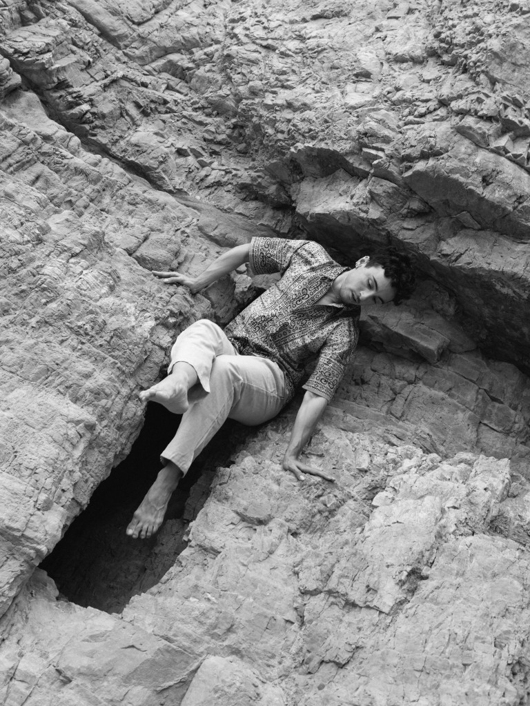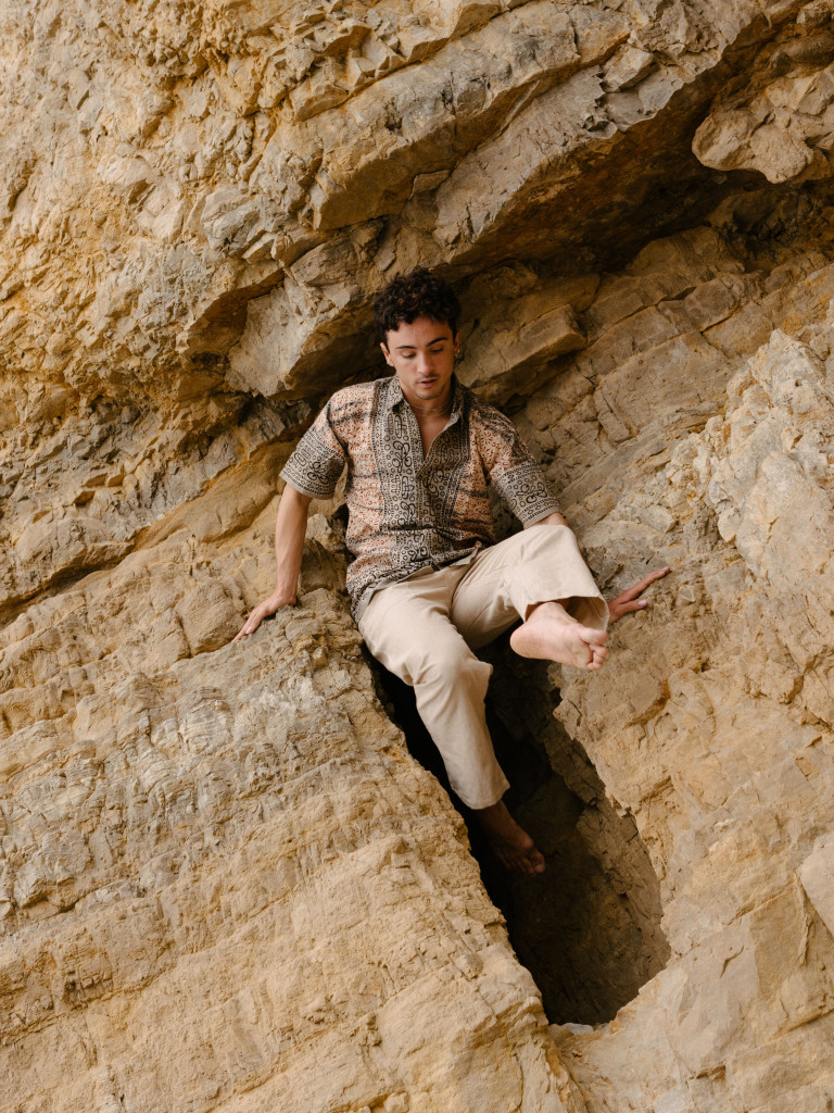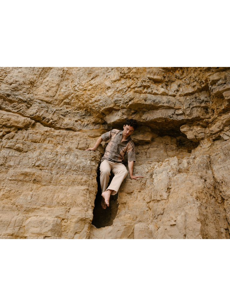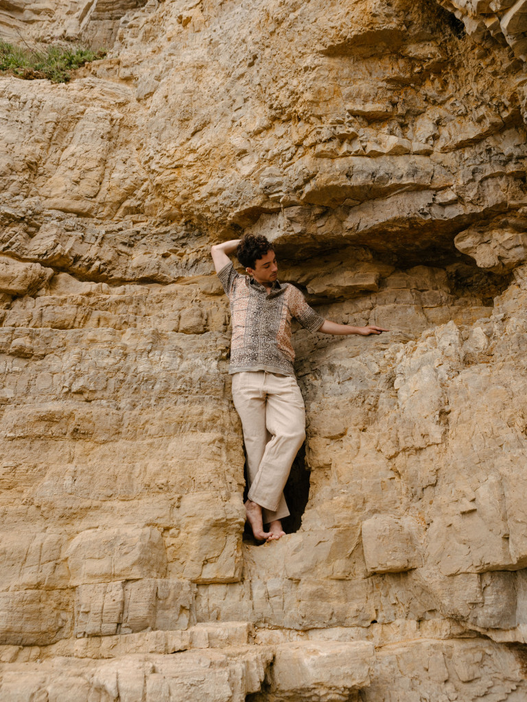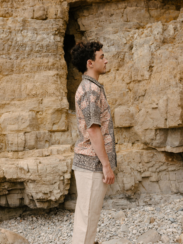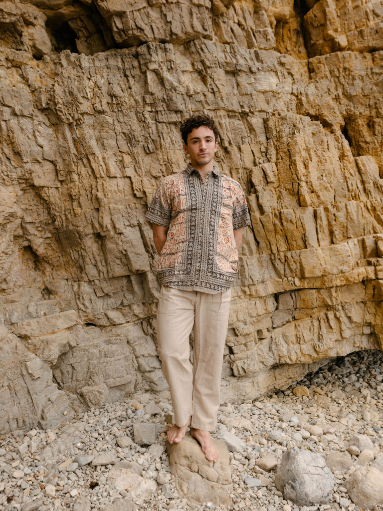 Nuestra nueva cami de yute tiene un estampado creado con Handblock en la parte delanteral y tiene el escote con detalles deshilachados.