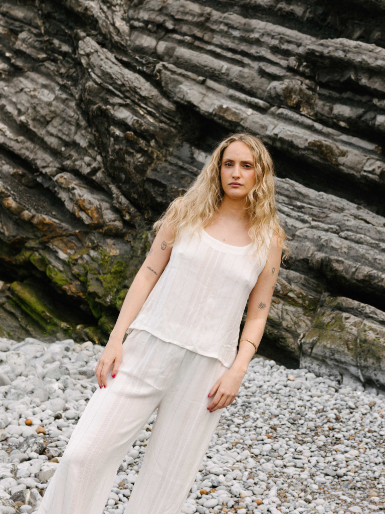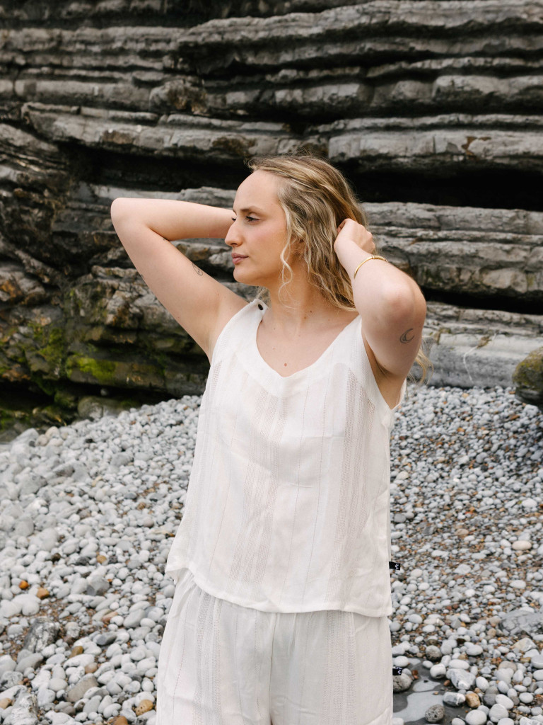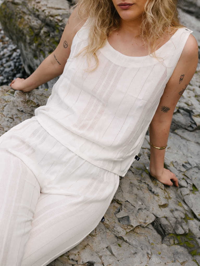 Nuestro pantalón Posidonia está confeccionado a mano con un tejido natural mezcla de algodón y lino que aporta elegancia y estilo.