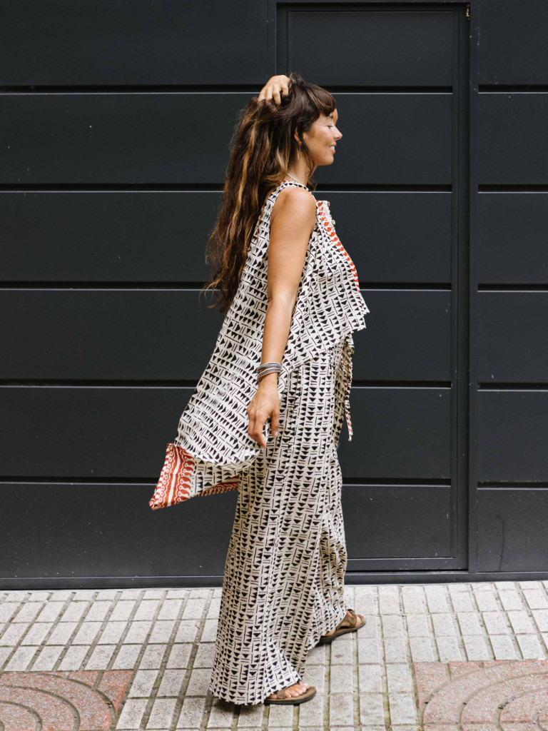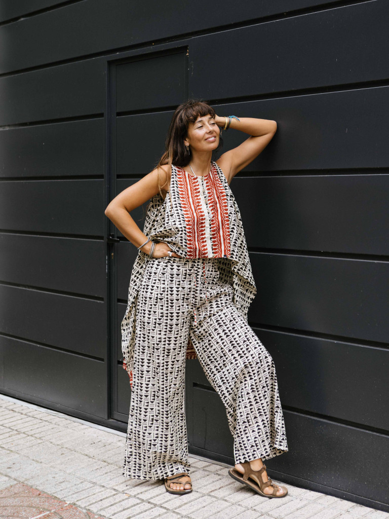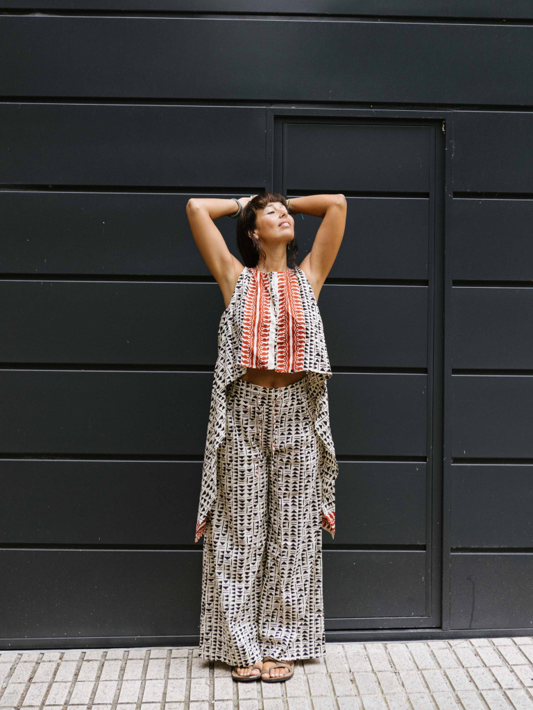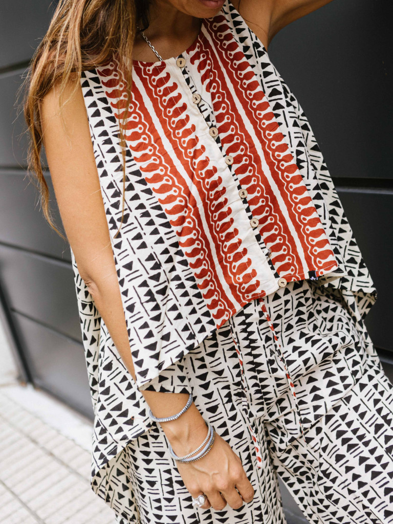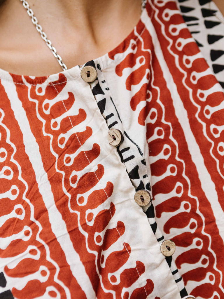 Confeccionado a mano con un fino tejido 100% algodón con un estampado étnico en negro, rojo y blanco roto que tanto favorece.