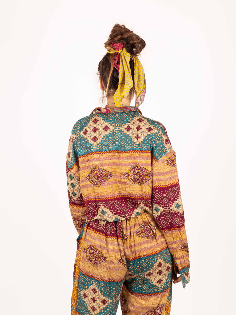 Diseñado a partir de sarees reciclados que elegimos uno a uno en nuestros viajes a India, cada conjunto Rangini es una pieza única que celebra la alegría, el movimiento y la autenticidad.