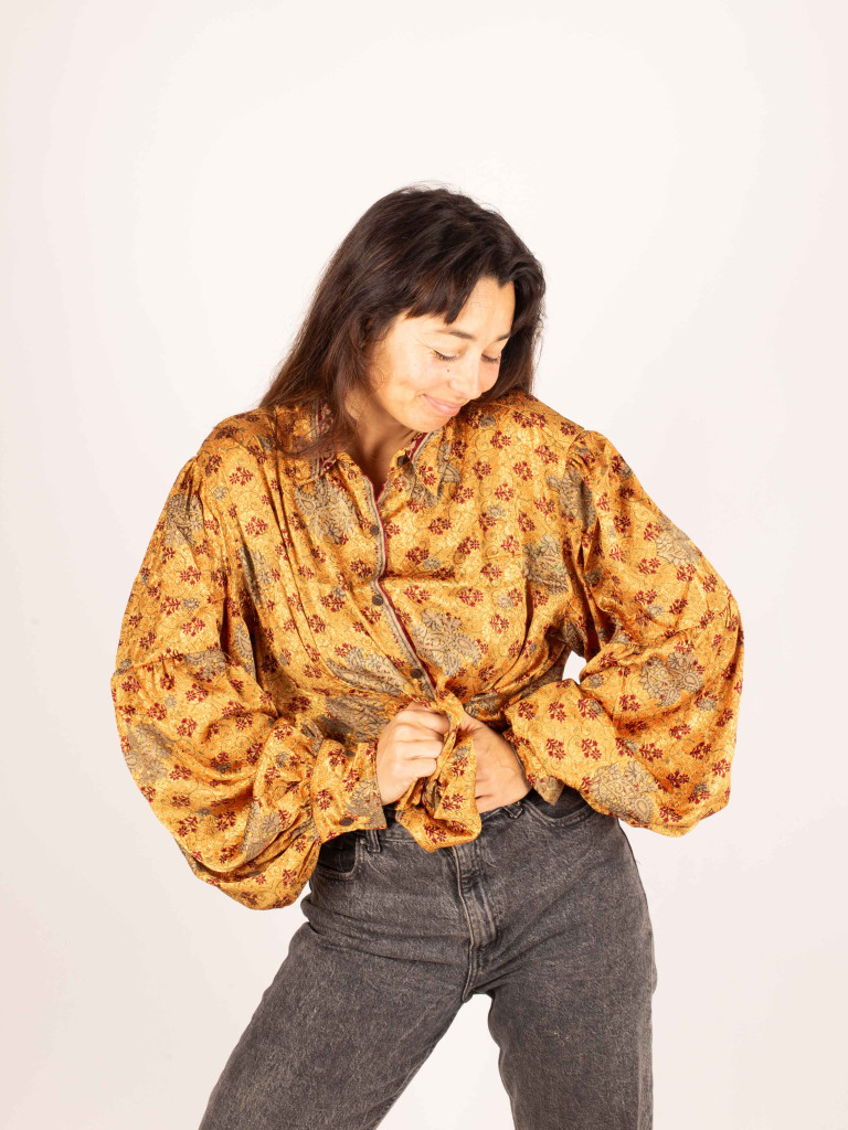 Camisa bohemia confeccionada a partir de sarees reciclados, cada pieza única y llena de historia. Su manga abombada, amplia y fluida, aporta un movimiento precioso. La parte trasera es ligeramente más larga, creando una silueta relajada y estilizada que favorece a todos los cuerpos.