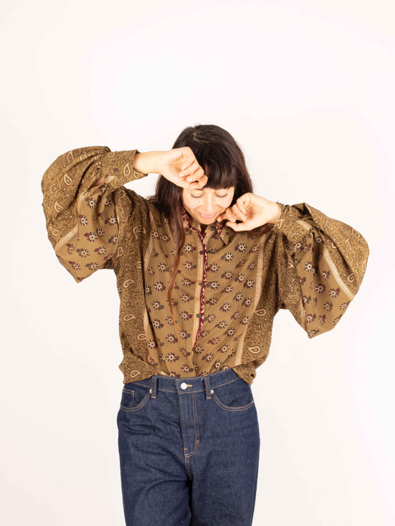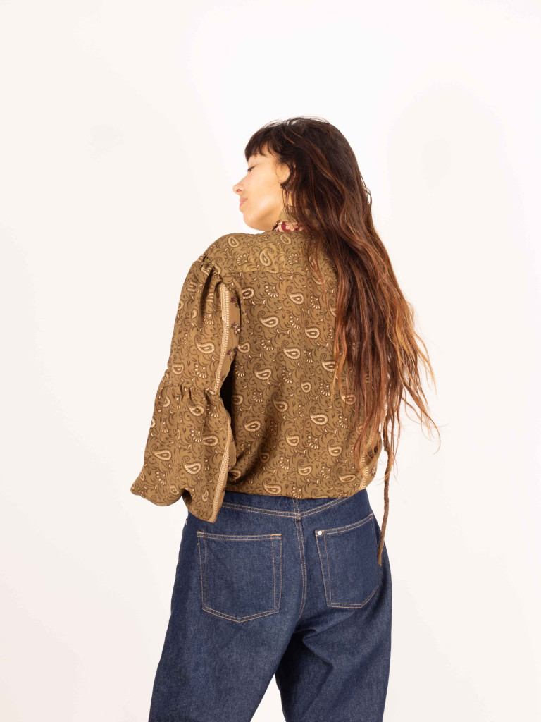 Es de color verde y está decorada con un tejido de etnico de colores en el cuello en v.