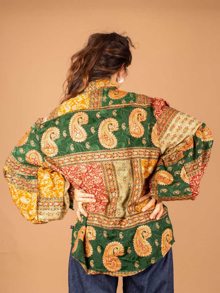 Es de color verde y está decorada con un tejido de etnico de colores en el cuello en v.