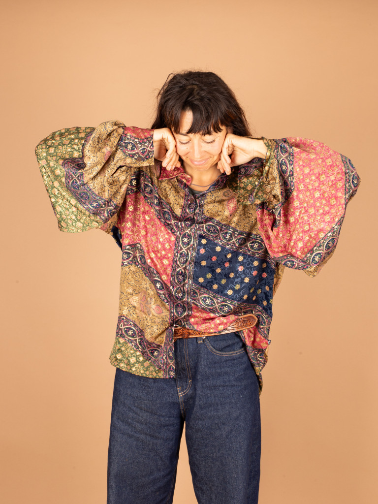 Es de color verde y está decorada con un tejido de etnico de colores en el cuello en v.