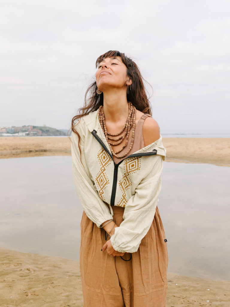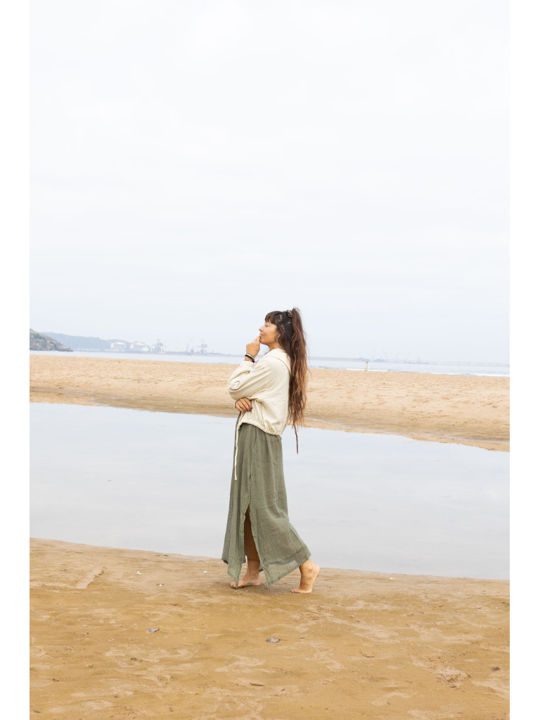 Una chaqueta larga confeccionada en un suave tejido de yute (100% vegetal) en color marrón conseguido mediante tintes naturales.