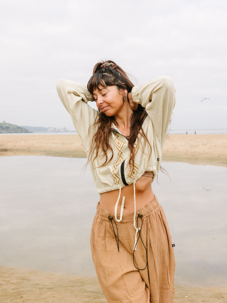 Decorada en la parte frontal y trasera con unas nuestro diseño étnico realizada mediante la técnica de estampación artesana y tradicional, handblock.