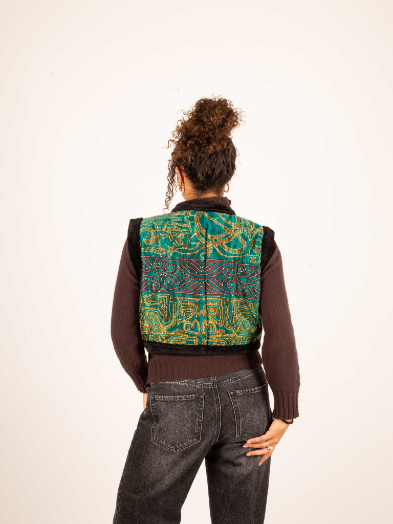 Chaleco confeccionado con tejidos tradicionales indios de saree reciclado, seleccionados uno a uno por su riqueza de color y estampado. Cada pieza es única y cuenta una historia diferente.