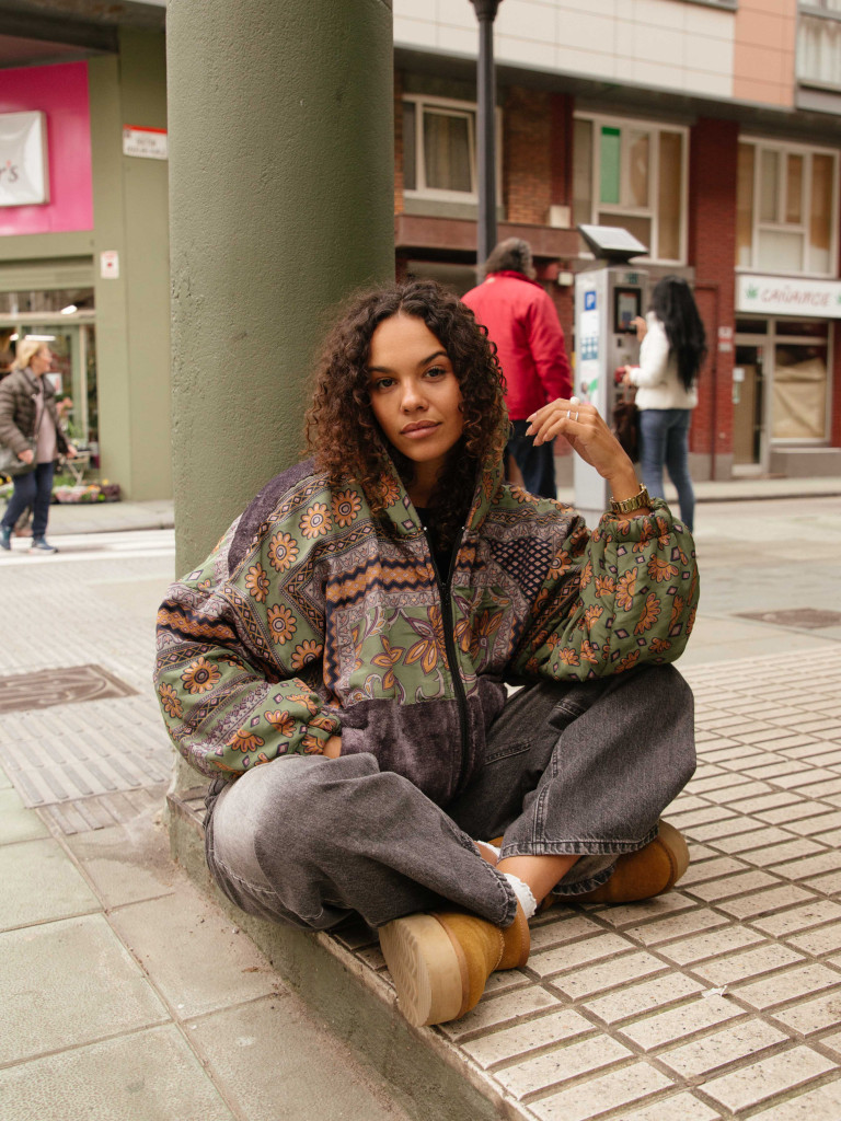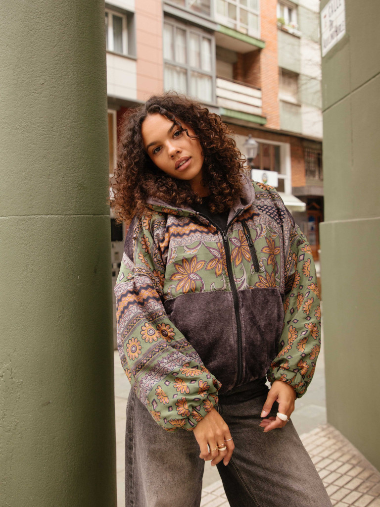 Una chaqueta elaborada con un tejido súper gustoso y calentito, decorada con telas tradicionales indias de sarees reciclados. Tiene capucha, perfecta para los días de viento, con dos bolsillos laterales y un bolso en el pecho con cierre de cremallera.
