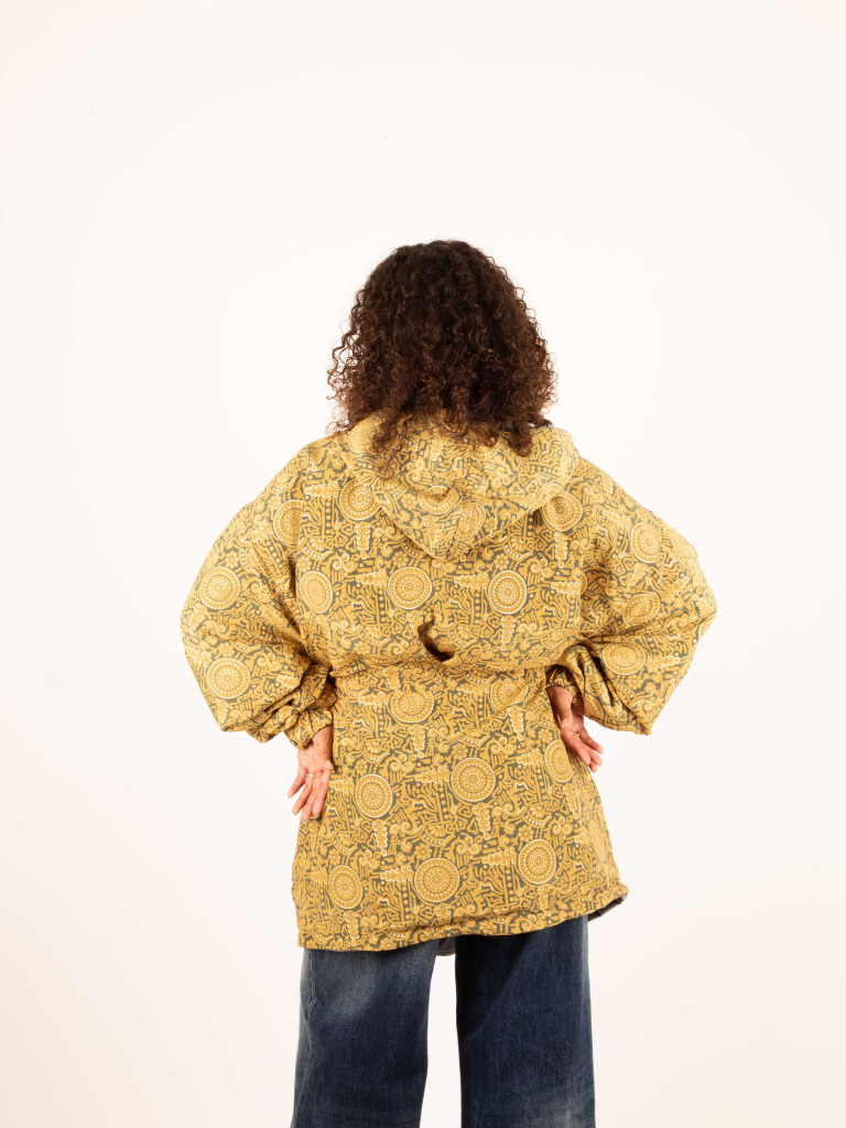 Por un lado, está confeccionado con tejido de chubasquero para protegerte de la lluvia y el viento. Por el otro, revela un precioso tejido de saree lleno de color y personalidad. Dos chaquetas en una sola prenda, para que puedas elegir el estilo según el día.