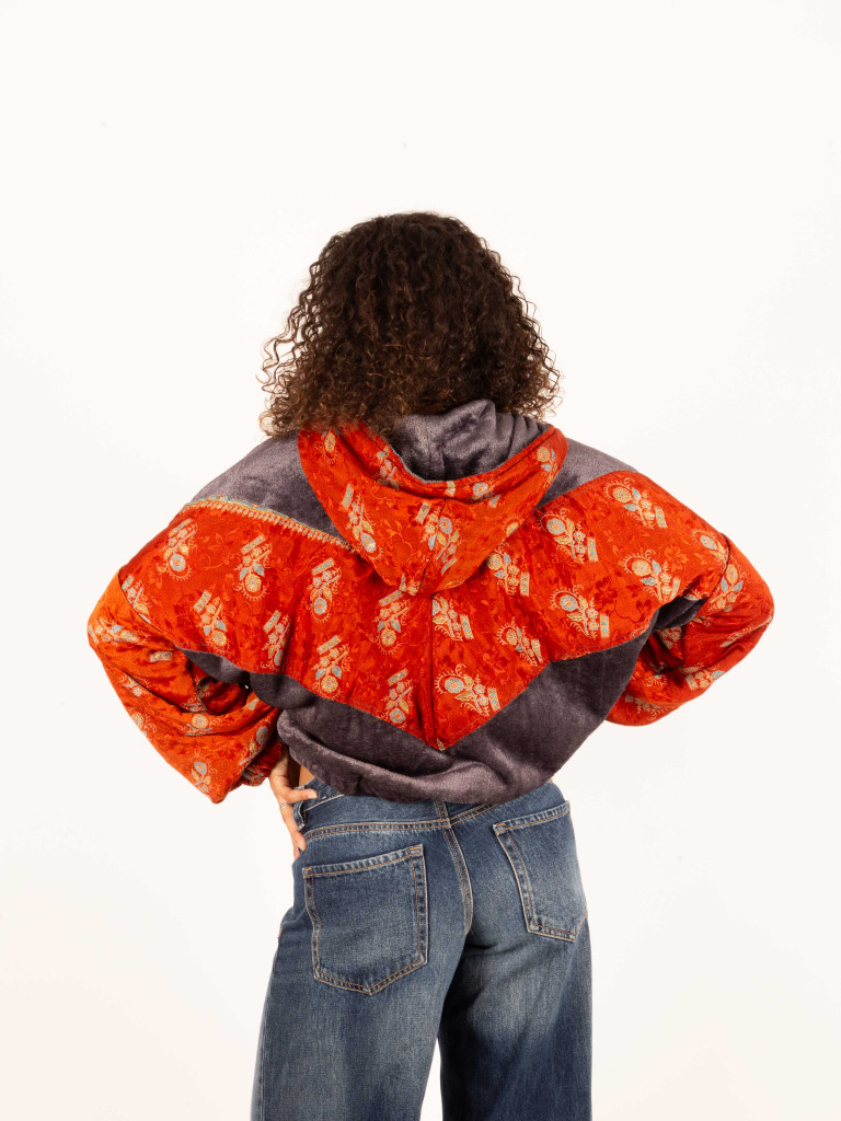 Una chaqueta elaborada con un tejido súper gustoso y calentito, decorada con telas tradicionales indias de sarees reciclados. Tiene capucha, perfecta para los días de viento, con dos bolsillos laterales y un bolso en el pecho con cierre de cremallera.