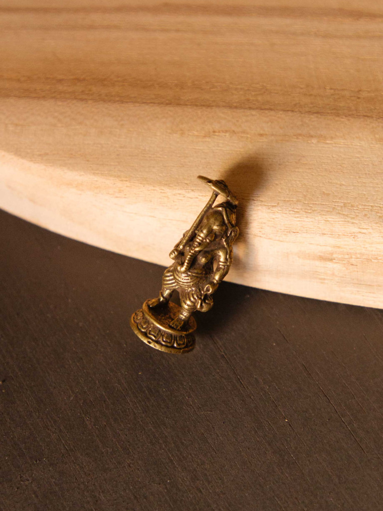 Mini figura de Ganesha elaborada en bronce, una pieza pequeña pero llena de significado espiritual. Su tamaño compacto la convierte en el amuleto perfecto para llevar contigo a todas partes: en el bolsillo, bolso o junto a tus llaves.
