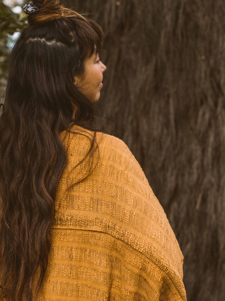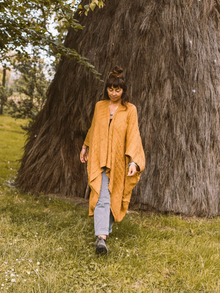 Elaborado a mano en un tejido calado 100% algodón, muy suave y de un precioso color mostaza antigua.