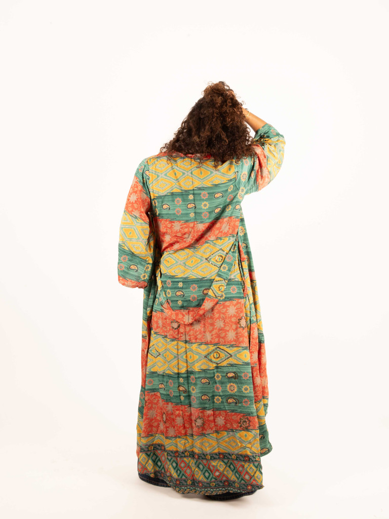 Confeccionado en una suave y ligera tela estampada de sarees reciclados, este kimono destaca por su corte fluido y asimétrico, siendo más largo por detrás para aportar un movimiento precioso al andar.