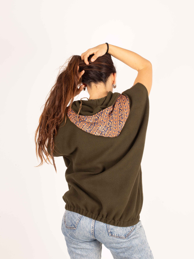 Chaleco polar con capucha confeccionado a partir de sarees reciclados, cada pieza es única y conserva los estampados tradicionales del tejido original. Su diseño combina la calidez del forro polar con el carácter artesanal de los paneles de algodón reciclado.