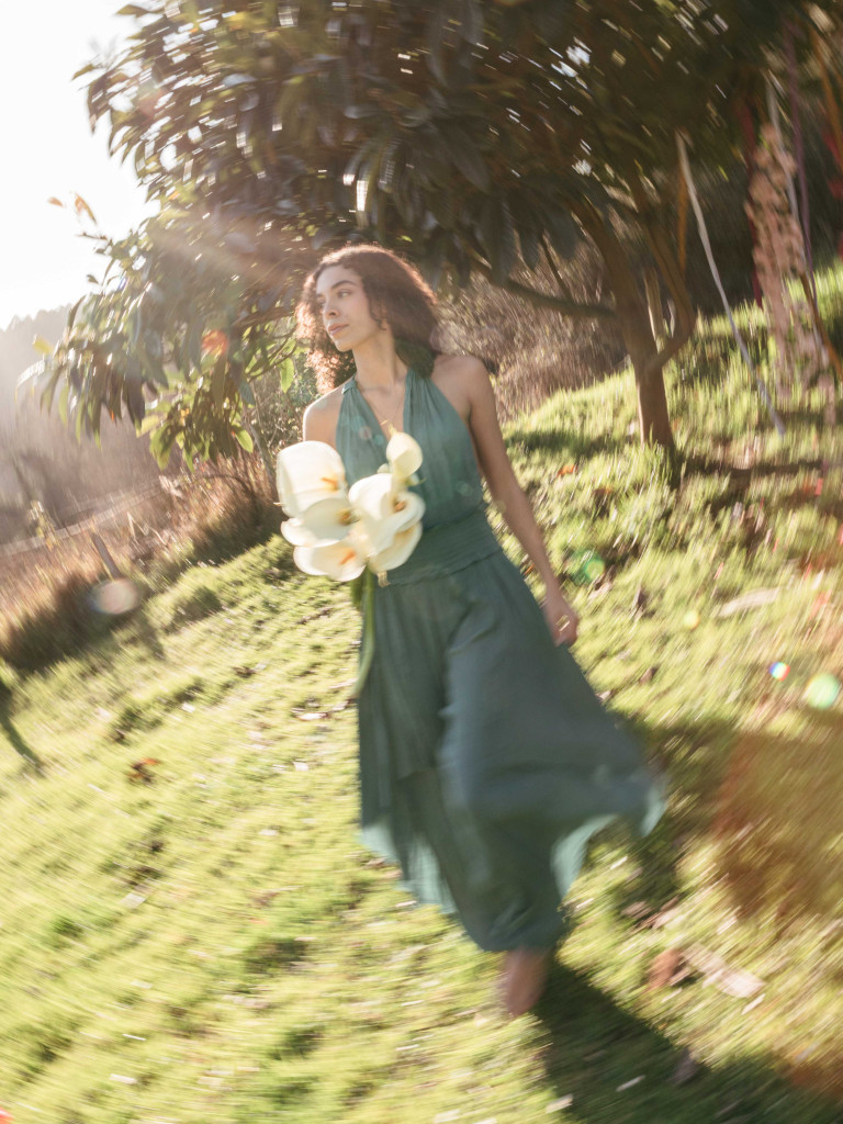 Mono fluido confeccionado en tejido de crepé de algodón en color turquesa, ligero y cómodo para el día a día o para ocasiones especiales. Su cintura elástica se adapta fácilmente al cuerpo.