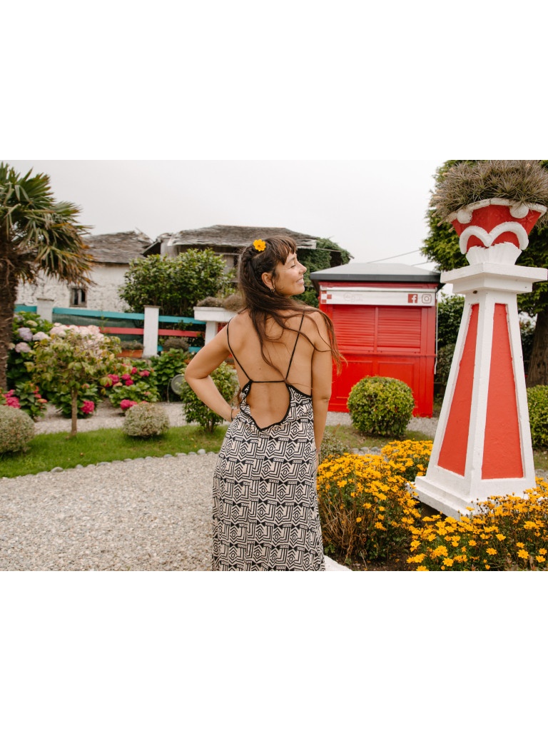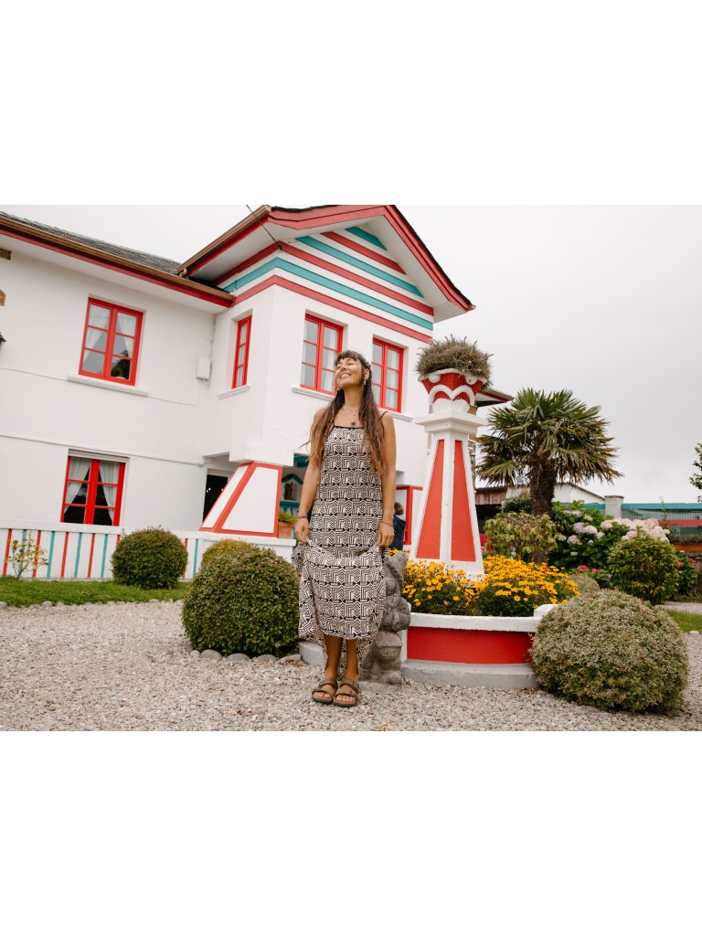 Confeccionado a mano en un tejido fluido de 100 % rayón fluido con un estampado etnico en tonos vainilla, mostaza y negro.