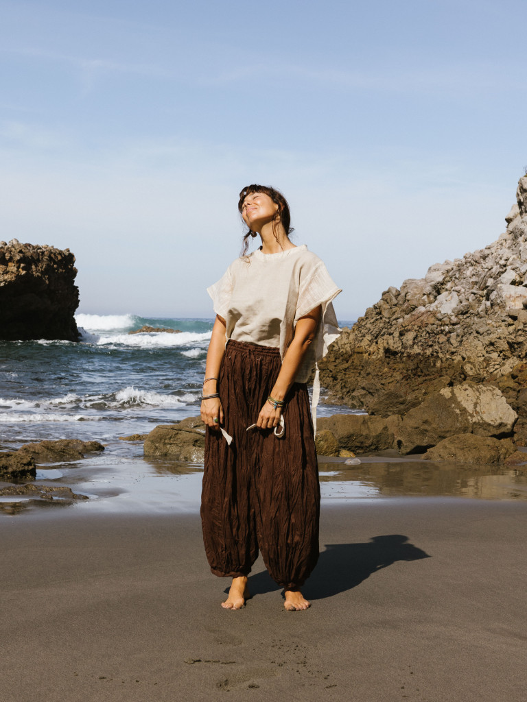 Este pantalón es sinónimo de libertad y comodidad. Confeccionado en algodón ligero, su diseño amplio y fluido permite un movimiento libre y una sensación de frescura durante todo el día. La cintura elástica se adapta suavemente al cuerpo, sin oprimir, haciendo que sea una prenda perfecta tanto para el día a día como para momentos de descanso o meditación.