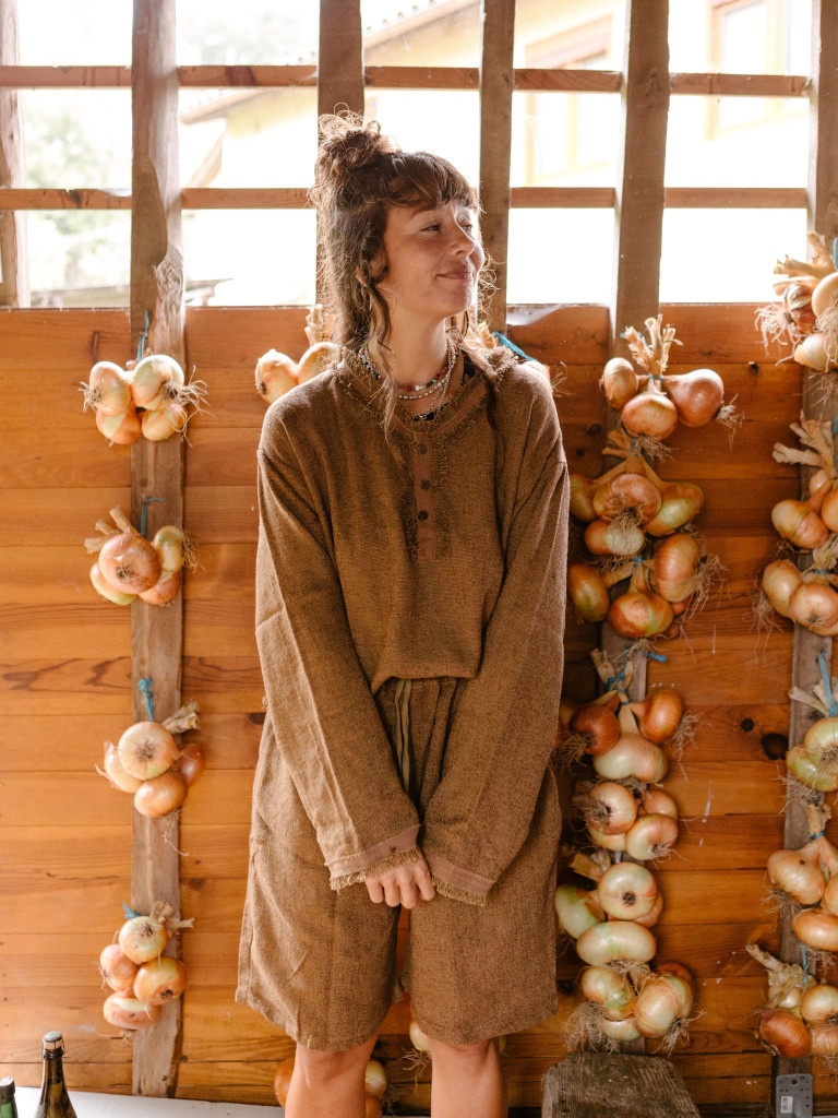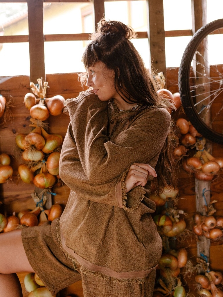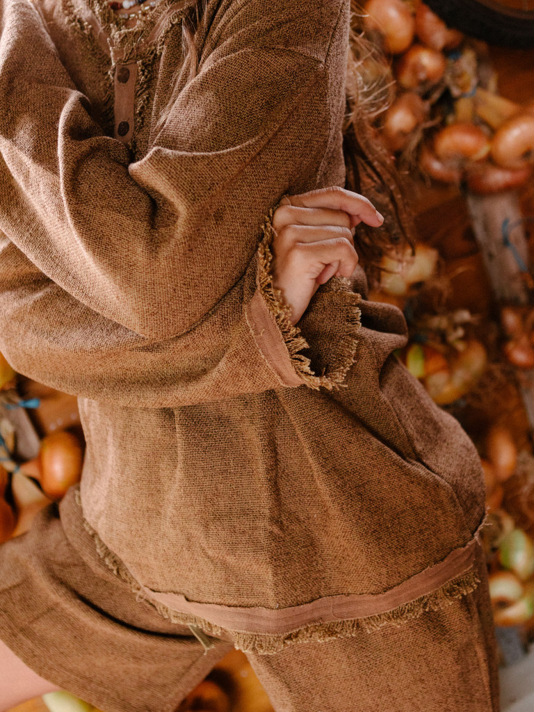 La camiseta es de manga larga y tiene botones de coco en el cuello. Rematamos la pieza con flecos en la parte de abajo, un sello de identidad entre nosotras.