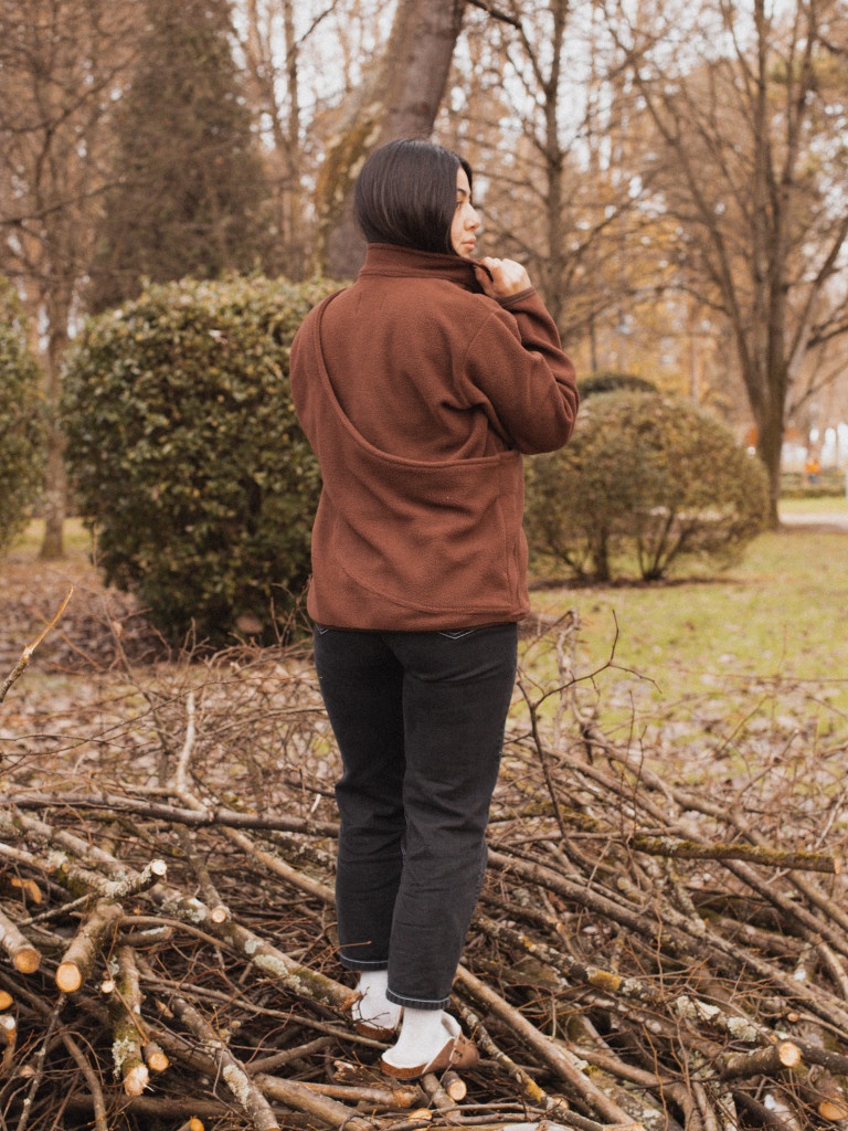 Esta confeccionada en polar de color marrón con botones de coco en el cuello con el que puedes jugar con su altura para que vayas bien abrigada.